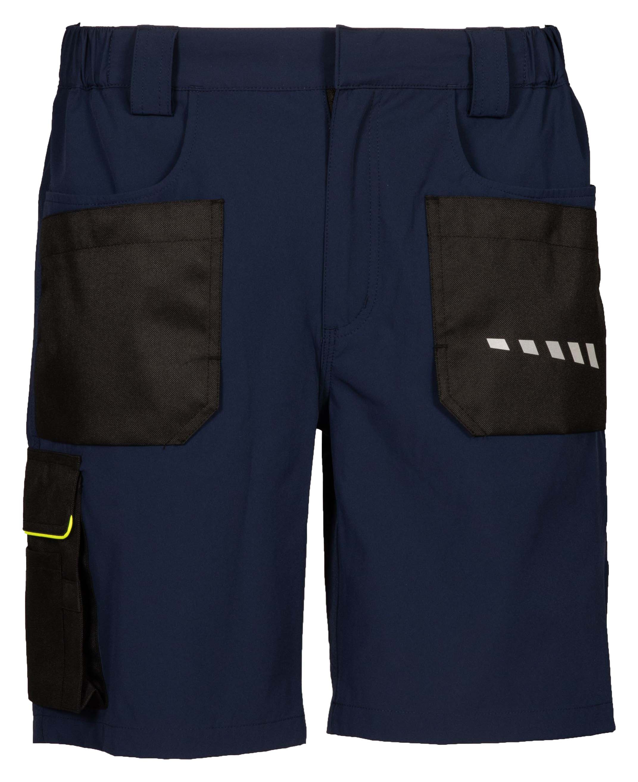 SHORTS IN 4-STRETCH FABRIC ELASTICIZED HORIZONTALLY AND VERTICALLY FOR MAXIMUM COMFORT - 90% nylon – 10% elastane - Reinforcing fabric in black, 400D anti-tear nylon - Reflective prints front and back - Two front pockets - Two applied anti-tear fabric pockets with covered snap buttons - One side pocket in 400D anti-tear nylon with removable keyring or badge clip; double pen holder and tool loop - Double back pocket for meter and tools in 400D anti-tear nylon with 4STRETCH logo - Two back pockets with velcro, in 400D anti-tear nylon - Fluorescent yellow piping on side and back pocket - Elasticated waistband and oversized belt loops - Covered snap button at waist - Triple stitching - No abrasive elements - No label SIZE CORRESPONDENCE: S42/44 M46/48 L50/52 XL54/56 XXL58/60 3XL62/64