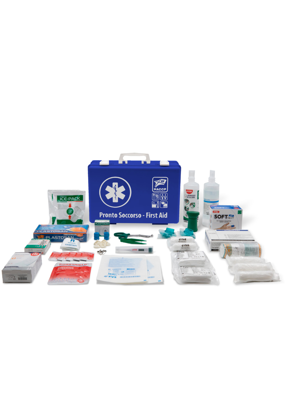 The First Aid Case is a complete and functional kit designed to provide rapid medical support in case of emergency. The blue color and compact design, which includes a carrying handle and a wall-mounting bracket, make it easy to carry and store. The neoprene gasket and the closure with two rotating clips ensure the safety and durability of the contents. It is suitable for professional use, indicated for environments such as bars, canteens, restaurants, and food companies, and is recommended for work groups of 3 or more people.