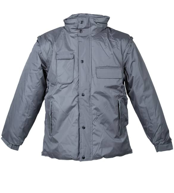Veste en ripstop imperméable et anti-déchirure - Rembourrage en polyester - Manches amovibles - Doublure en polaire anti-bouloches - Capuche escamotable en ripstop avec fermeture coupe-vent - Une poche sur la poitrine avec velcro, avec porte-badge escamotable intégré - Deux poches extérieures à fermeture éclair - Une poche intérieure pour téléphone portable - Double porte-stylo - Poche intérieure portefeuille - Fermetures éclair internes en bas et sur la poitrine pour personnalisation au dos et sur le cœur - Poignets élastiques réglables avec velcro - Fermetures éclair latérales pour réglage de la taille - Intérieur col en polaire - Profils rétroréfléchissants sur l'intérieur du col, les poignets et les rabats de poche - Boutons-pression automatiques en métal