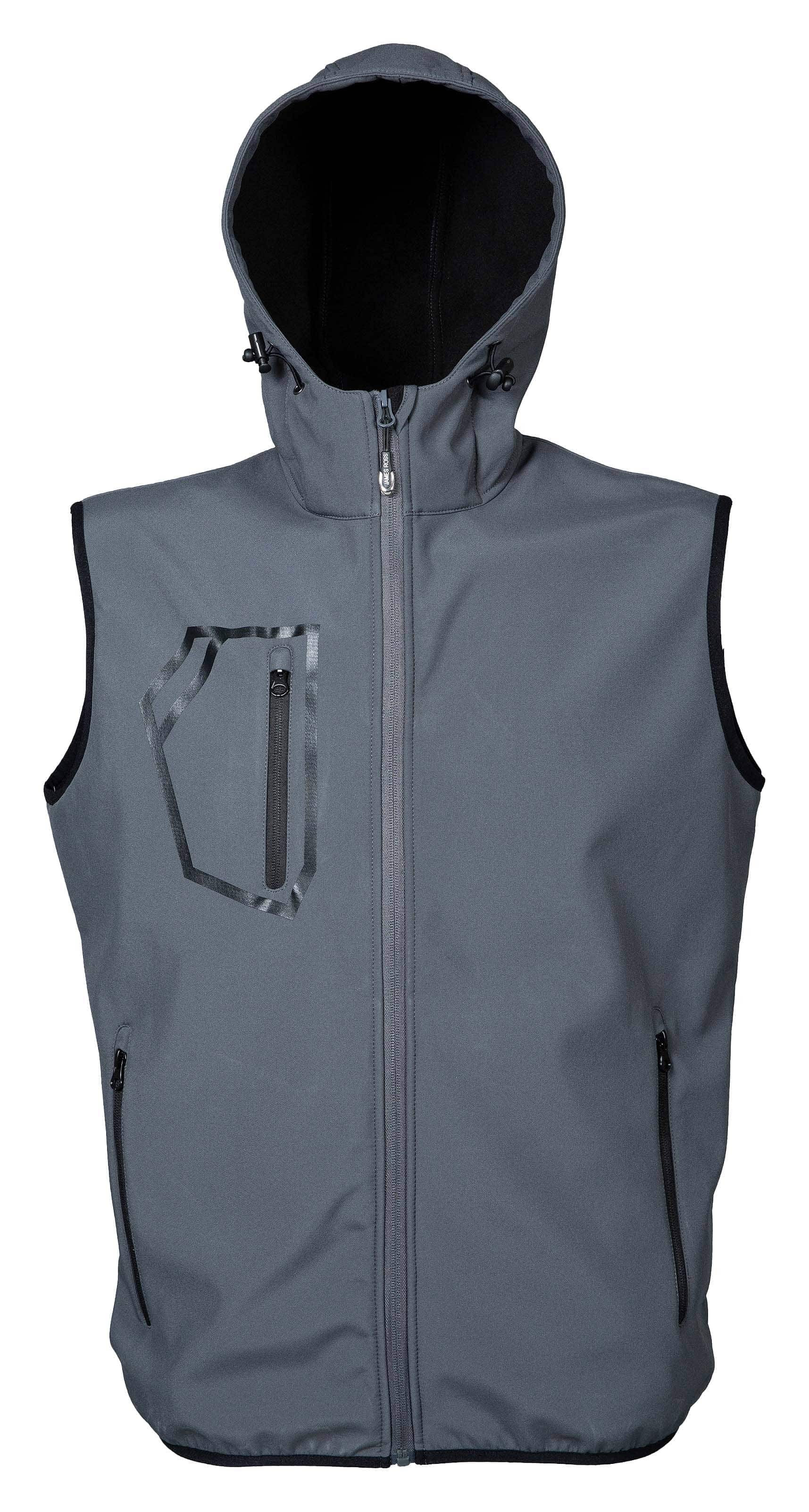 Gilet in soft shell a due strati con trattamento idrorepellente - 96% poliestere- 4% elastan - Trattamento 14000 g/M2/24h - Interno in pile antipilling - Stampe rifrangenti posteriori sulle spalle - Cappuccio con coulisse - Cerniere nastrate - Una tasca con zip sul petto con sagoma tasca stampata - Due tasche esterne con zip - Tessuto elastico nel giromanica - Tessuto elastico al fondo