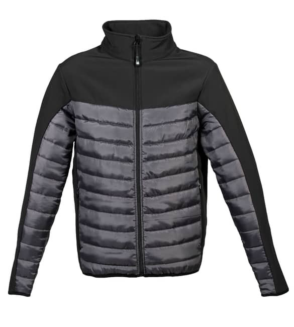 Giubbino in tessuto composito - Corpo e parte inferiore manica in 100% poliestere 300 T cire, con imbottitura in soffice poliestere (effetto piuma) - Spalle, fianchi e parte superiore del busto e della manica in softshell a 2 strati, con interno in pile antipilling - Zip nastrate YKK - Due tasche esterne con zip - Nastro di rinforzo interno collo e tessuto appendiabito - Tessuto elastico ai polsi - Tessuto elastico al fondo