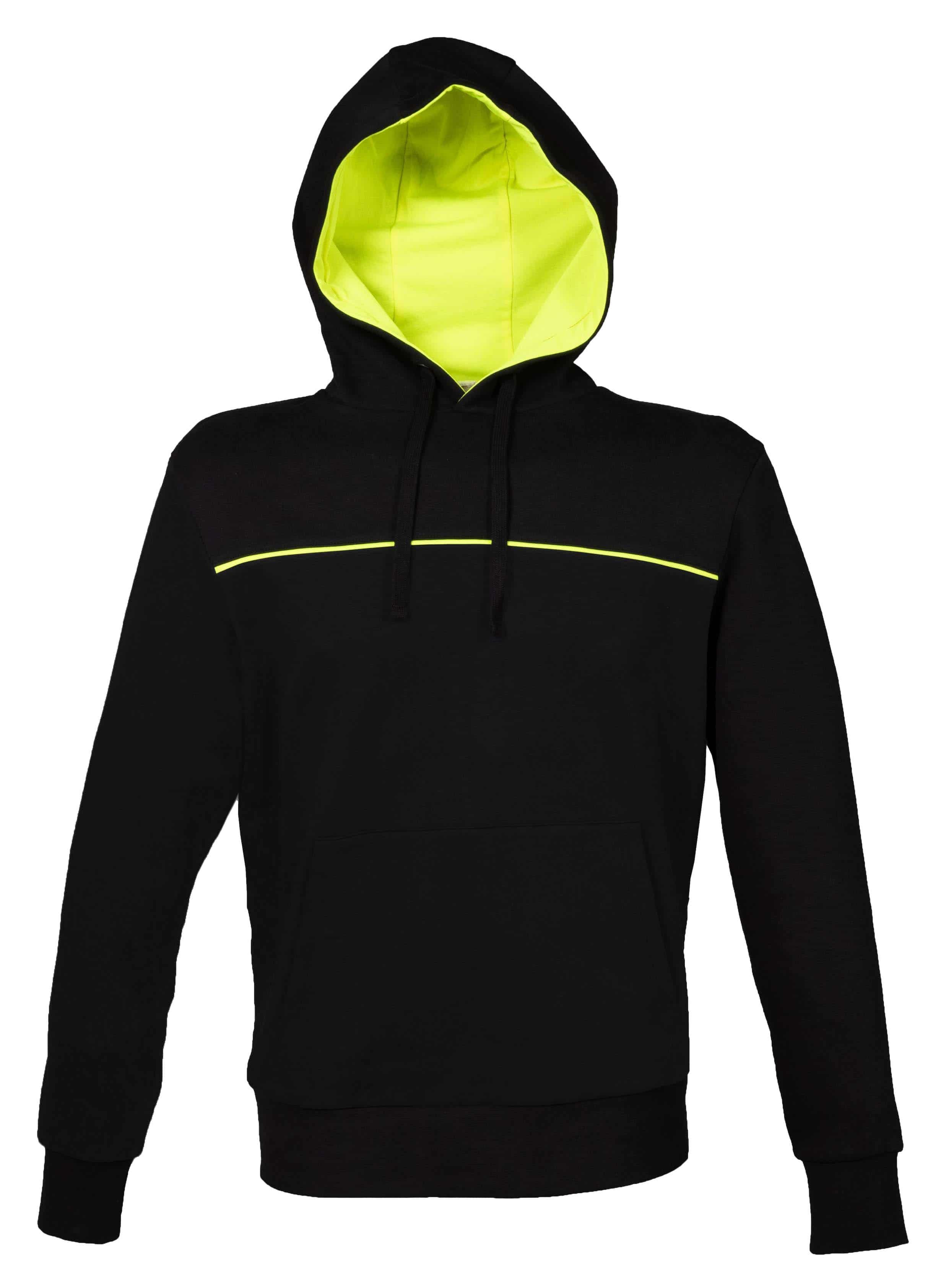 FELPA BICOLORE 80%COTONE – 20% POLIESTERE - Cappuccio foderato in jersey giallo fluo - Cordini neri - Attaccatura collo incrociata - Piping giallo fluo anteriore e posteriore - Tasca a marsupio - Polsini e fondo maglia in costina elasticizzata - Nastro di rinforzo giallo fluo all'interno del collo - Cuciture ribattute