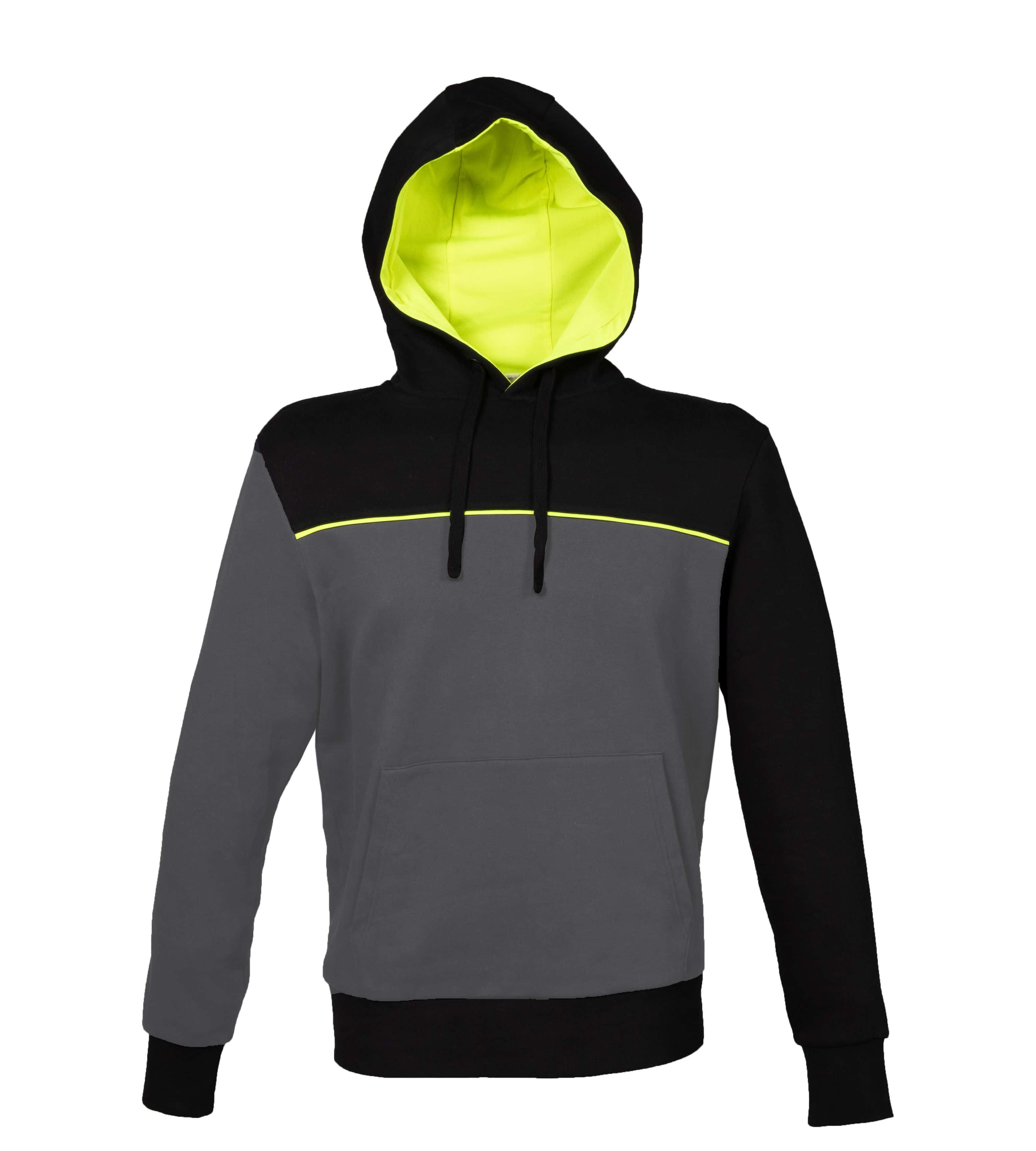 FELPA BICOLORE 80%COTONE – 20% POLIESTERE - Cappuccio foderato in jersey giallo fluo - Cordini neri - Attaccatura collo incrociata - Piping giallo fluo anteriore e posteriore - Tasca a marsupio - Polsini e fondo maglia in costina elasticizzata - Nastro di rinforzo giallo fluo all'interno del collo - Cuciture ribattute