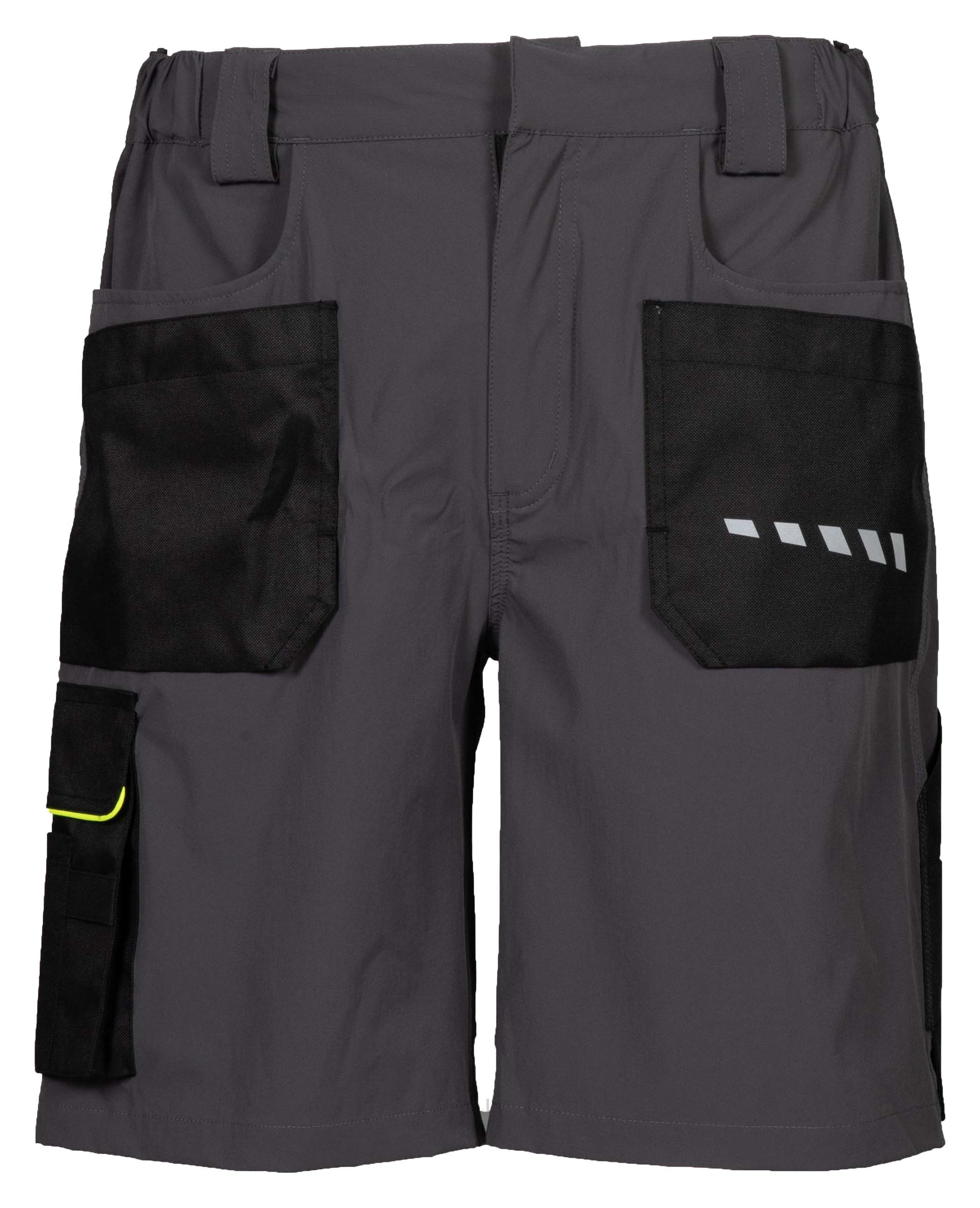 PANTALONE CORTO IN TESSUTO 4 STRETCH ELASTICIZZATO IN ORIZZONTALE E VERTICALE PER IL MASSIMO COMFORT - 90% nylon – 10% elastan - Tessuto di rinforzo color nero, in nylon 400D antistrappo - Stampe rifrangenti anteriori e posteriori - Due tasche anteriori - Due tasche applicate in tessuto antistrappo con bottoni automatici coperti - Una tasca laterale in nylon 400D antistrappo con gancio estraibile portachiave o portabadge; doppio portapenne e passante porta utensile - Doppia tasca posteriore portametro e portautensili in nylon 400D antistrappo e logo 4STRETCH - Due tasche posteriori con velcro, in nylon 400D antistrappo - Piping giallo fluo sulla tasca laterale e posteriore - Elastici in vita e passanti maggiorati - Bottone automatico in vita coperto - Triple cuciture - Nessun elemento graffiante - No label CORRISPONDENZA TG.: S42/44 M46/48 L50/52 XL54/56 XXL58/60 3XL62/64