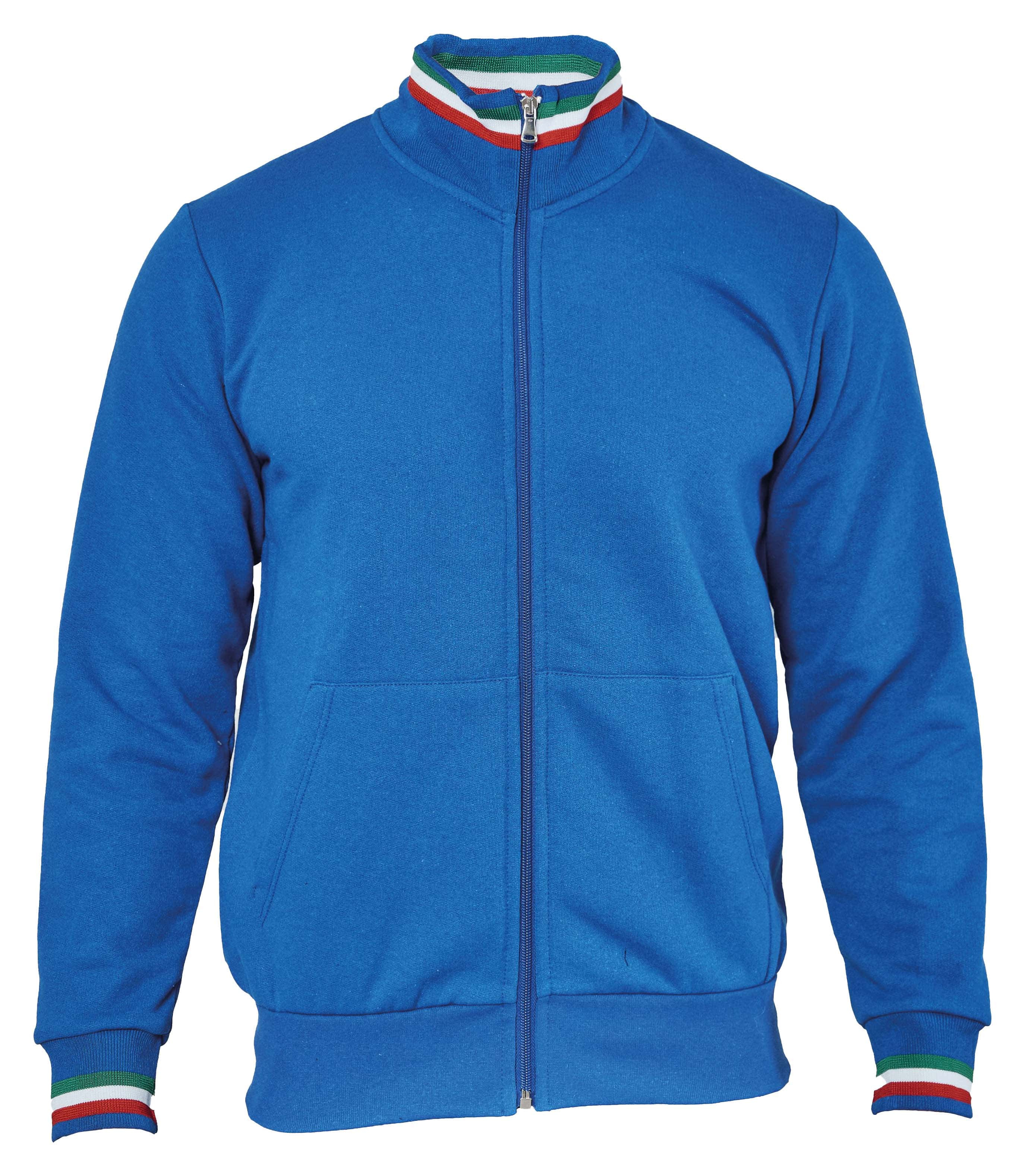 FELPA MADE IN ITALY ECOLOGICA - Composizione: 50% cotone riciclato 50% poliestere riciclato - Zip lunga - Tricolore interno ed esterno collo e sui polsini - Collo a lupetto - Nastro di rinforzo interno collo - Due tasche a marsupio - Collo, polsini e fondo maglia in costina elasticizzata - Non imbustata