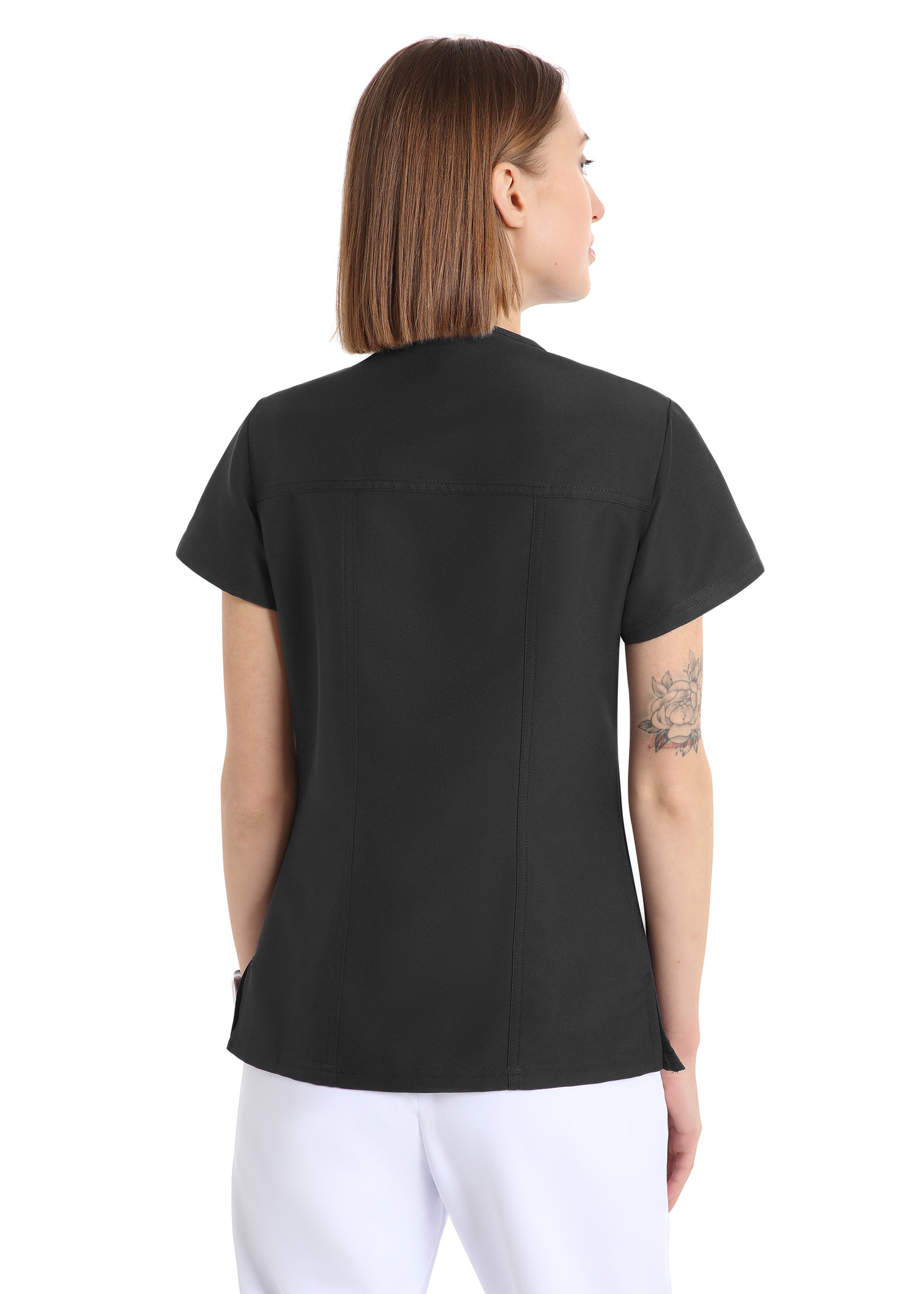 Collo a V, cucitura orizzontale sopra il petto, linea aderente, manica corta.