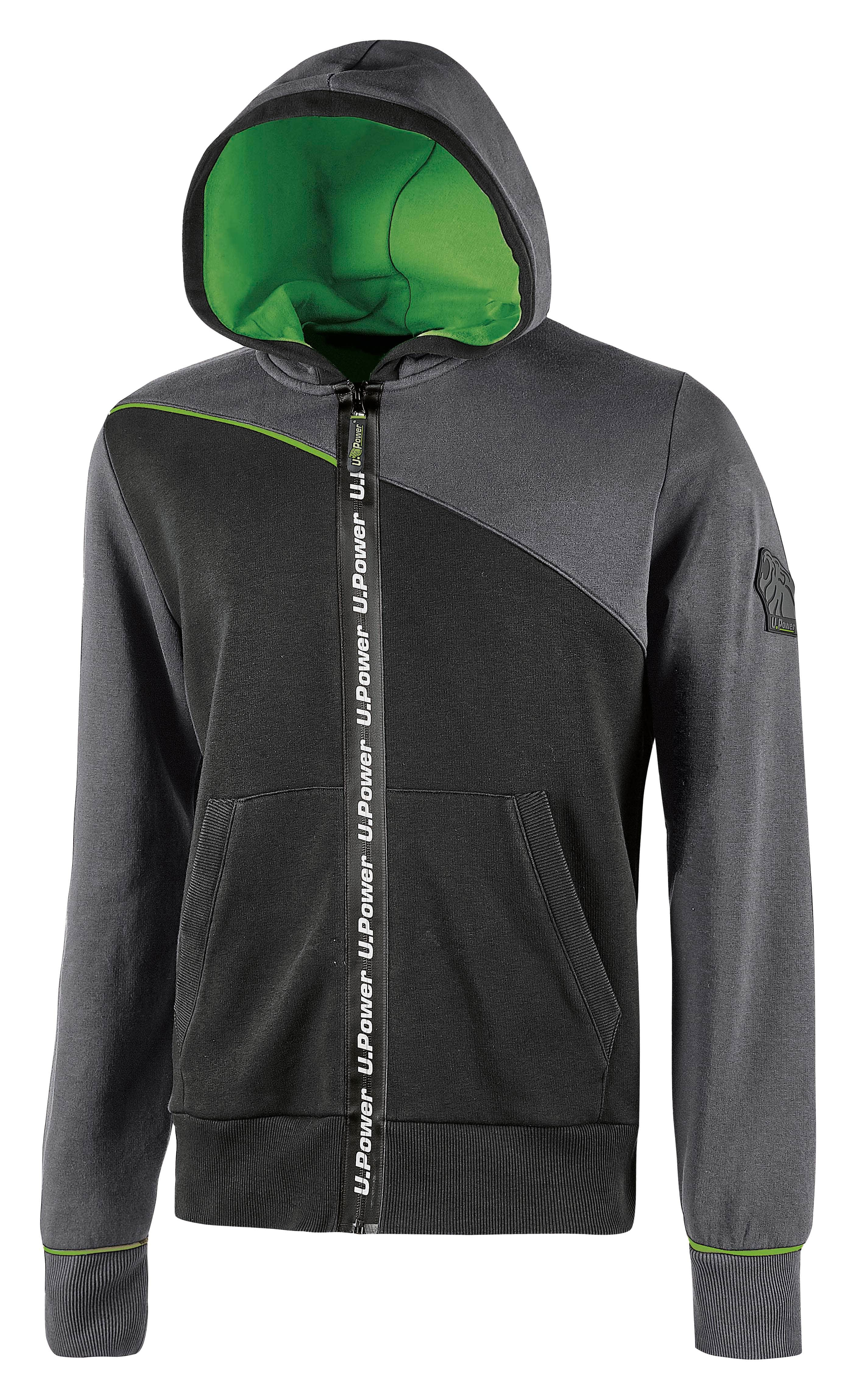 Felpa da lavoro impermeabile U-Power Jupiter, con chiusura a zip centrale e design unico. Incorporati inserti in piping fluo e cappuccio regolabile per maggiore comfort.