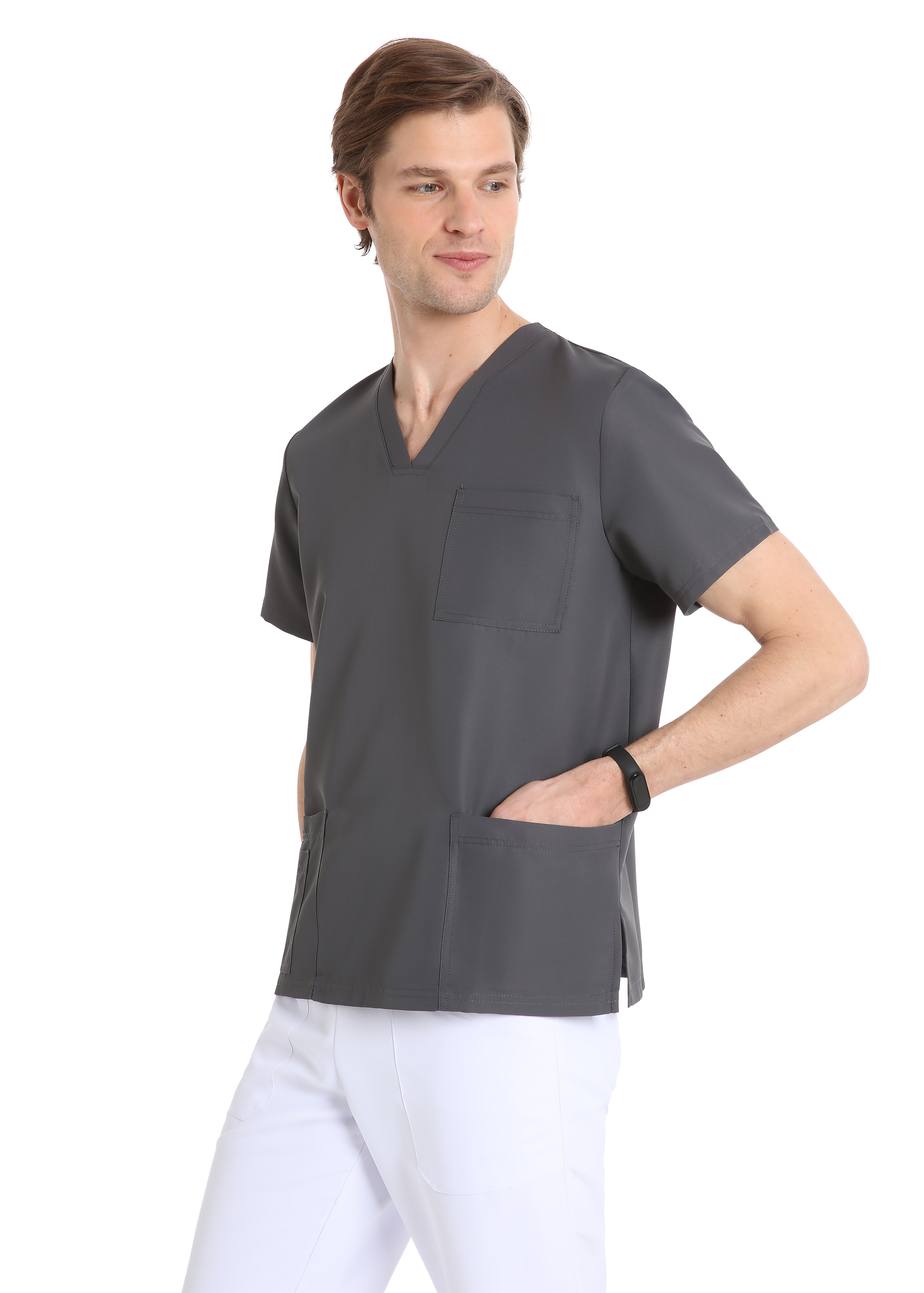 Casacca unisex con collo a V, un taschino e due tasche. Manica corta e spacchetti laterali. Veste bene sia uomini che donne. Colore brillante.