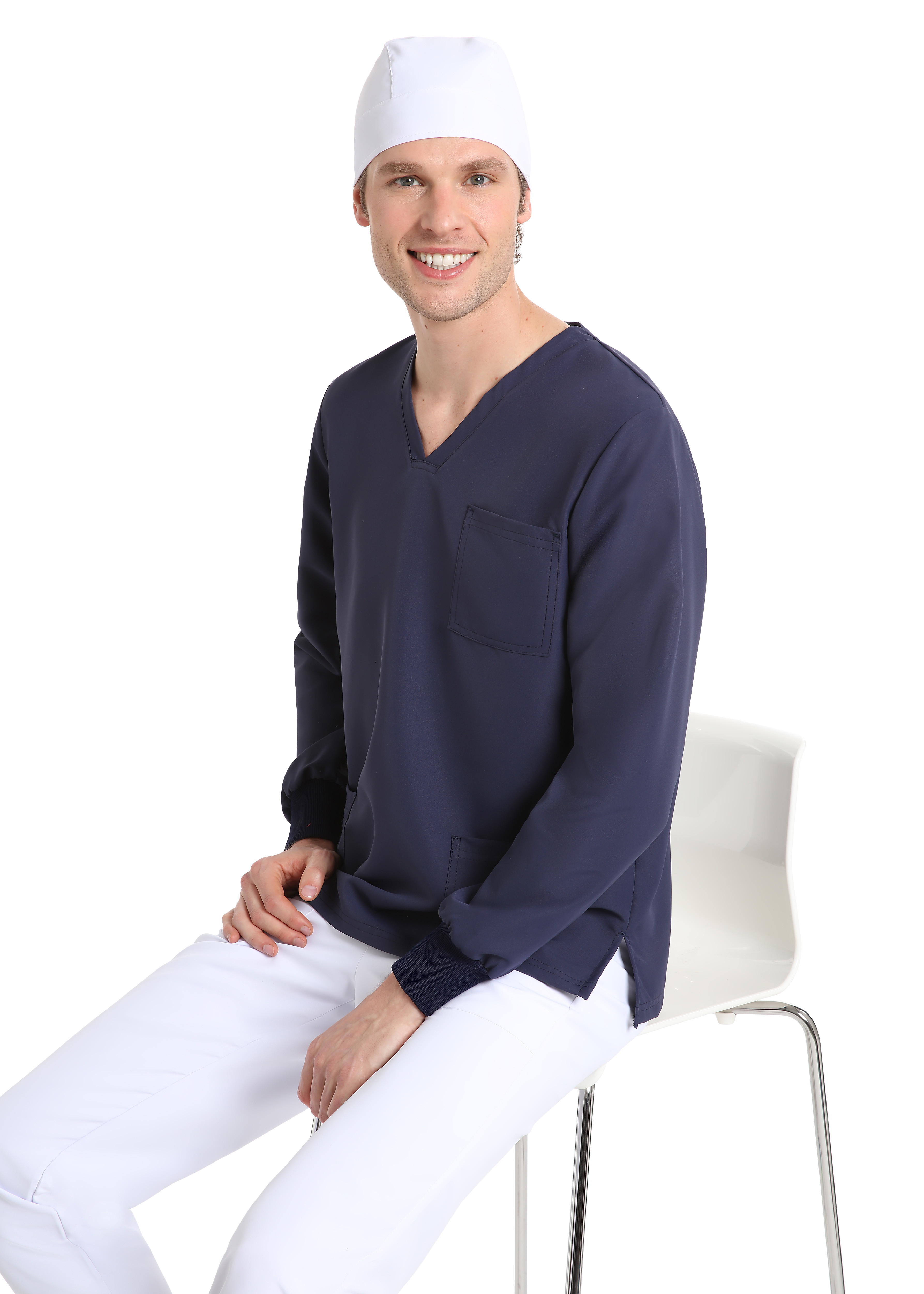 Collo unisex a V, un taschino e due tasche. Manica lunga e spacchetti laterali. Con con polsino in maglia, morbido, resistente e indemagliabile, in tinta con la casacca. Il modello veste bene sia uomini che donne.  Colore brillante.