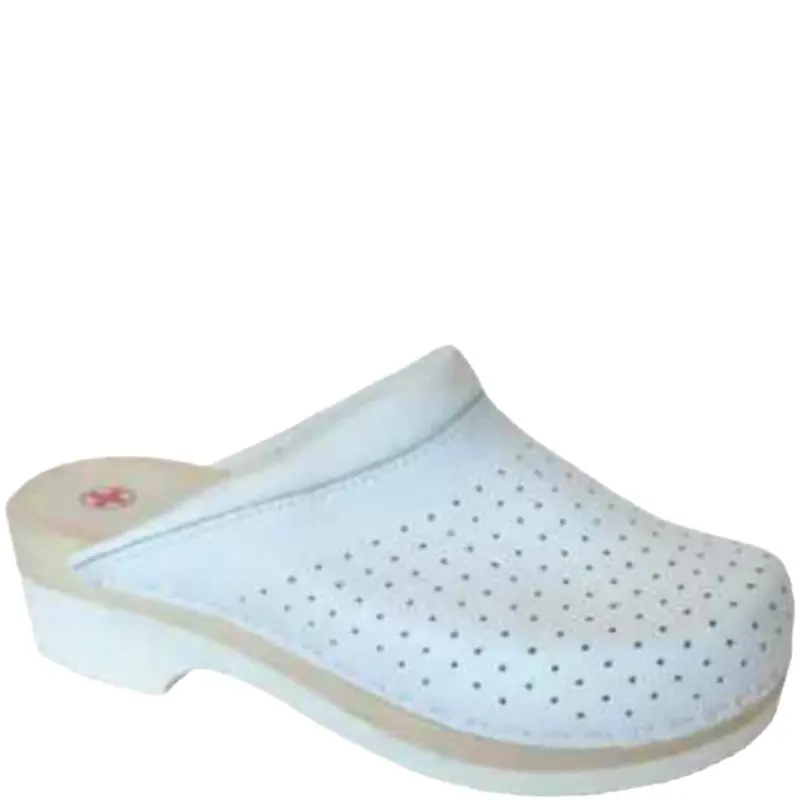 Comfort e sicurezza si uniscono in questo zoccolo con suola in legno e gomma. La tomaia in pelle forata garantisce una ventilazione ottimale, mentre il design ergonomico offre un supporto eccellente per lunghe giornate di lavoro.